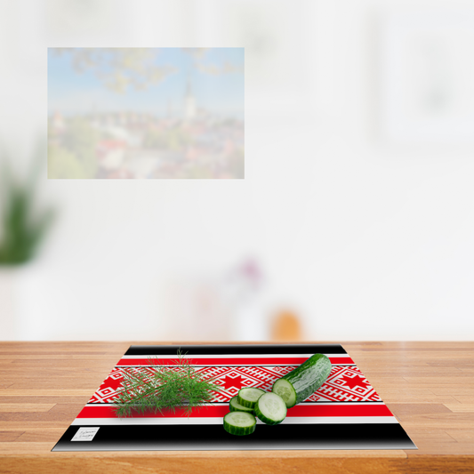 Practical, durable, and strikingly beautiful – these glass chopping boards bring Estonian heritage right into the heart of your kitchen. Printed with folk designs, they are as versatile as they are stylish. Perfect for everyday chopping, elegant serving, or even as a protective hot plate for your table.